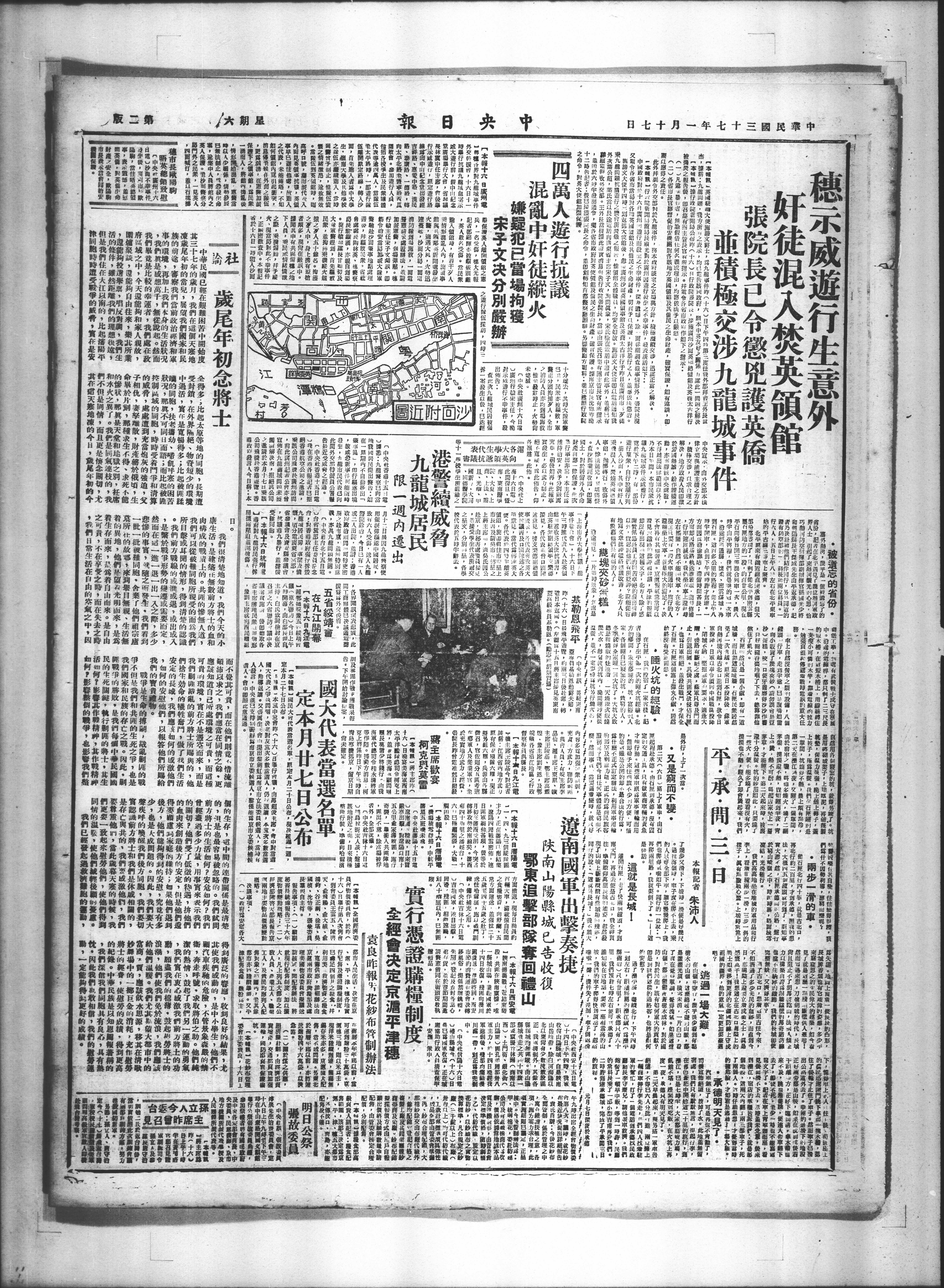 伍雕開原定將線,轉入沙 至太平路時,一邮遊行除 代表等逾四萬人,當除伍 包括各校學生及民衆随體 園散會。參加遊行人貞, 向太平北路至豐寧西瓜 路、泰康路、一德裕,轉 吉祥路、惠爱中路,漢民 線由中山紀念堂出發經 行示威遊行,原定遊行路 長林翼中任主席,會後舉 堂廣塲畢行大會,省种議 威大遊行前,假中山紀念 時舉行抗議九龍城血案示 外交後援會,十六日十一 一鼻檀各界對九龍城事件 本報十六日廣州電