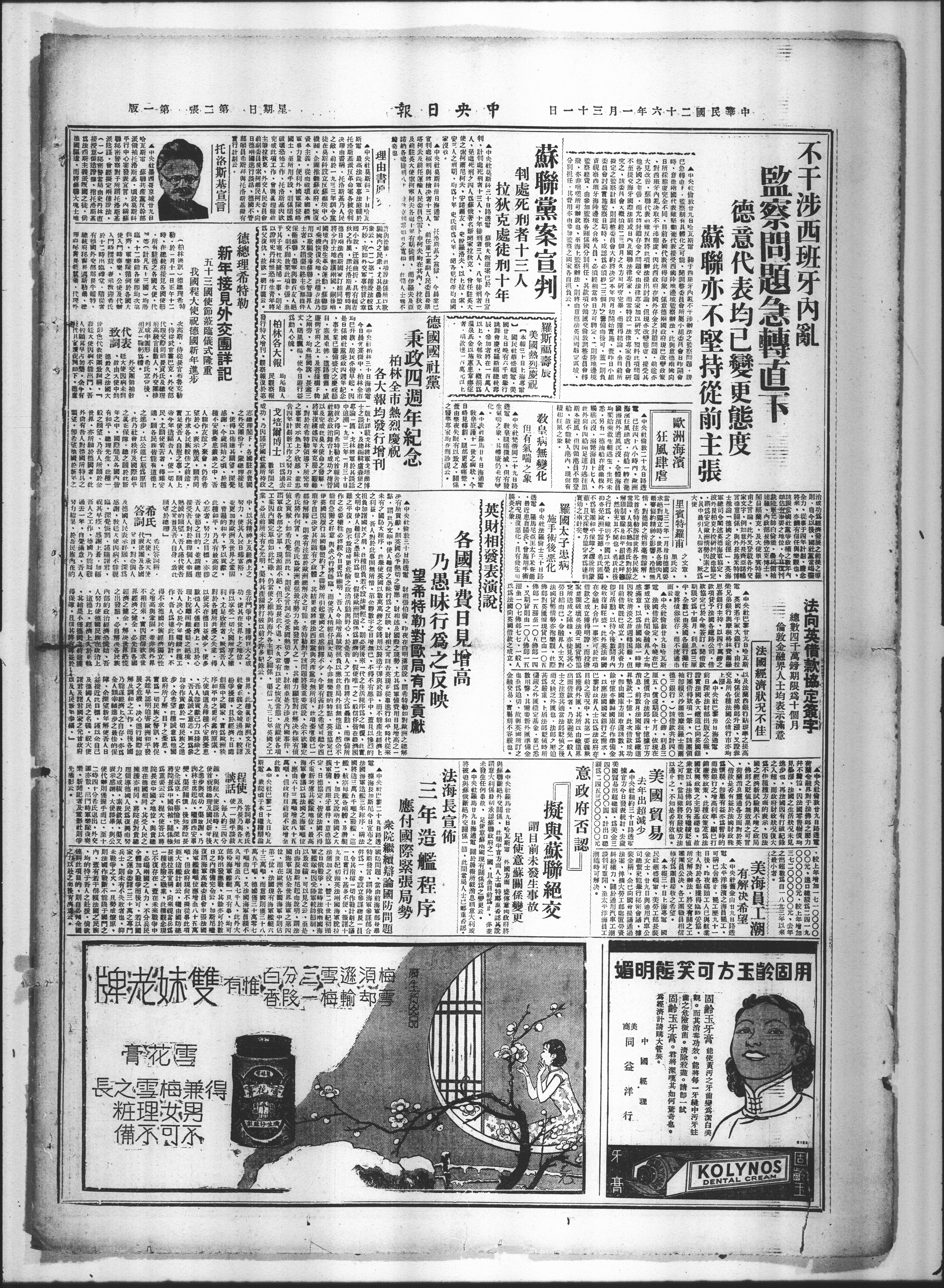 以爲過去數年間之成功、乃因謹守國社黨所持政治成功為經濟發展之前提之原則、自今以後、國社黨當竭盡全力、從事于四年計劃、瞻念將來、亦饒有信任與樂觀也、該報當國社黨爭政權之數年内頗佔有專要之地位、今日復刊裁陸軍元帥白倫堡、農民領袖達羅、内政部長佛立克博士、閣員福蘭克、及大使里賓特羅甫之言論。
