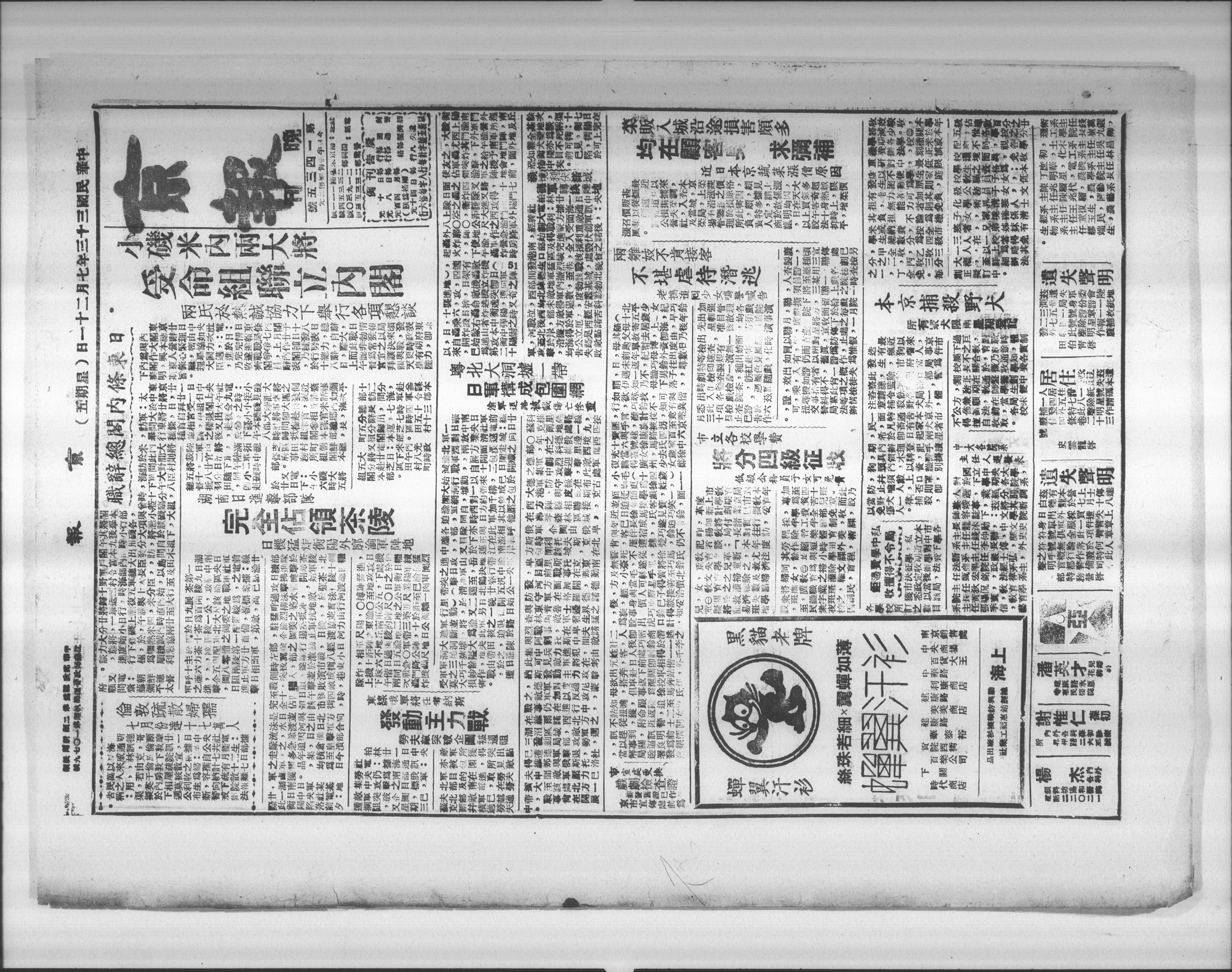 内閣》東條繼理大臣,乃收齊閣員辭表,於十八日上午督宫拜天皇陛 爲作興人心,舉國邁進完遂戰爭,内閣乃行總辭,而認爲宜讓輿更有力 與大本營緊密協力,於完逾戰爭上作種種努力,際此非常之決戰時期, 內閣總辭理由如次:日情報局七月廿日發表,自大戰勃發以來,政府卽